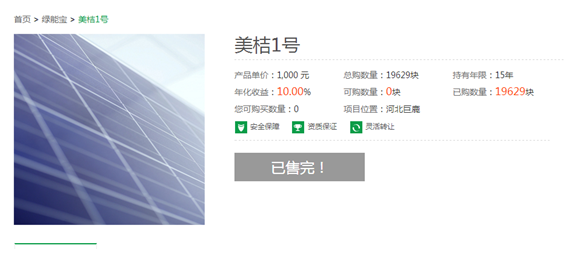 綠能寶此次推出的產(chǎn)品“美桔1號”,是一款基于委托融資實物租賃項目的綠色、低碳新型“理財”產(chǎn)品。通過這一環(huán)保金融項目讓大家能夠共同參與太陽能發(fā)電站的建設,在抗擊霧霾、恢復藍天、保護地球環(huán)境的同時產(chǎn)生良好的生態(tài)收益,從而讓每一個人成為太陽能的生產(chǎn)者與收獲者(m.nngyjqw.com )。 馬云淚奔,余額寶被秒殺!