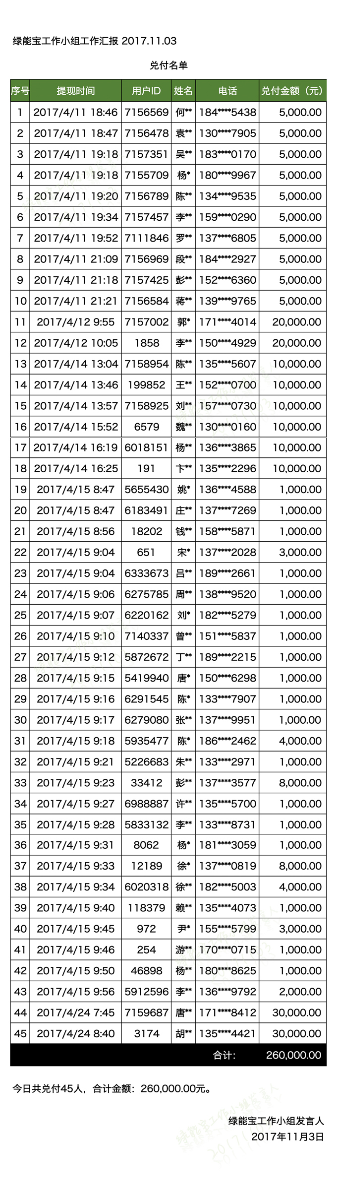 兌付名單(2017年11月3日)