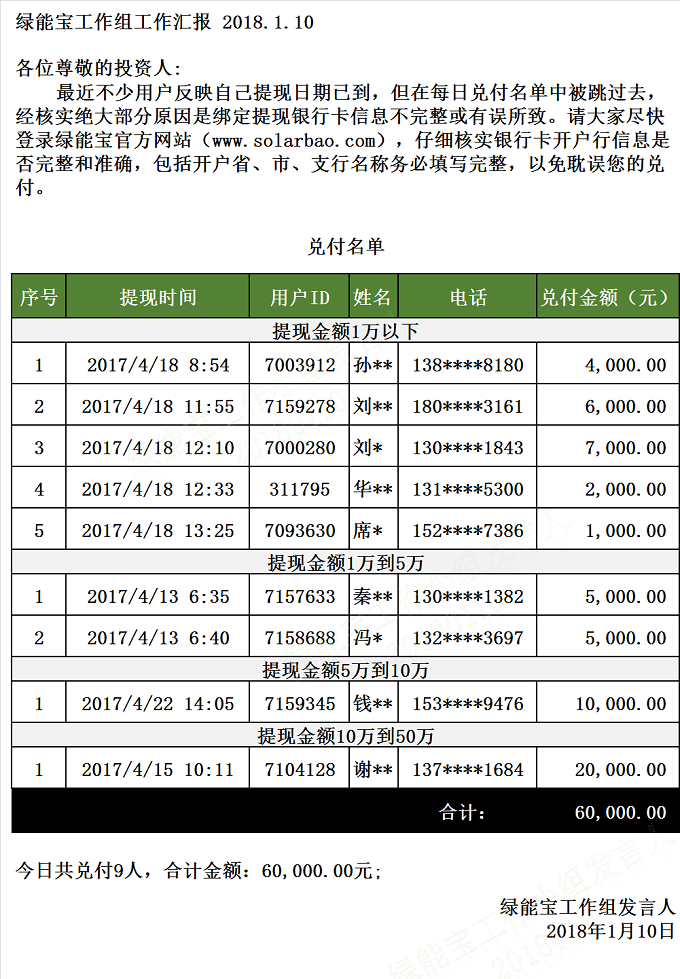 兌付名單(2018年1月10日)