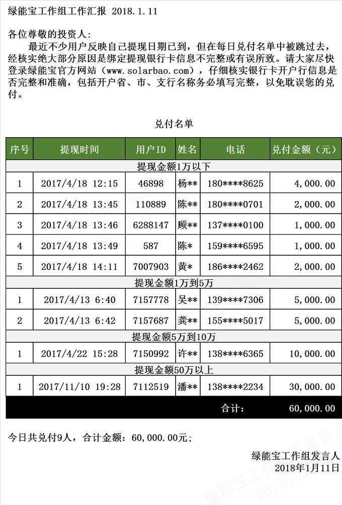兌付名單(2018年1月11日)