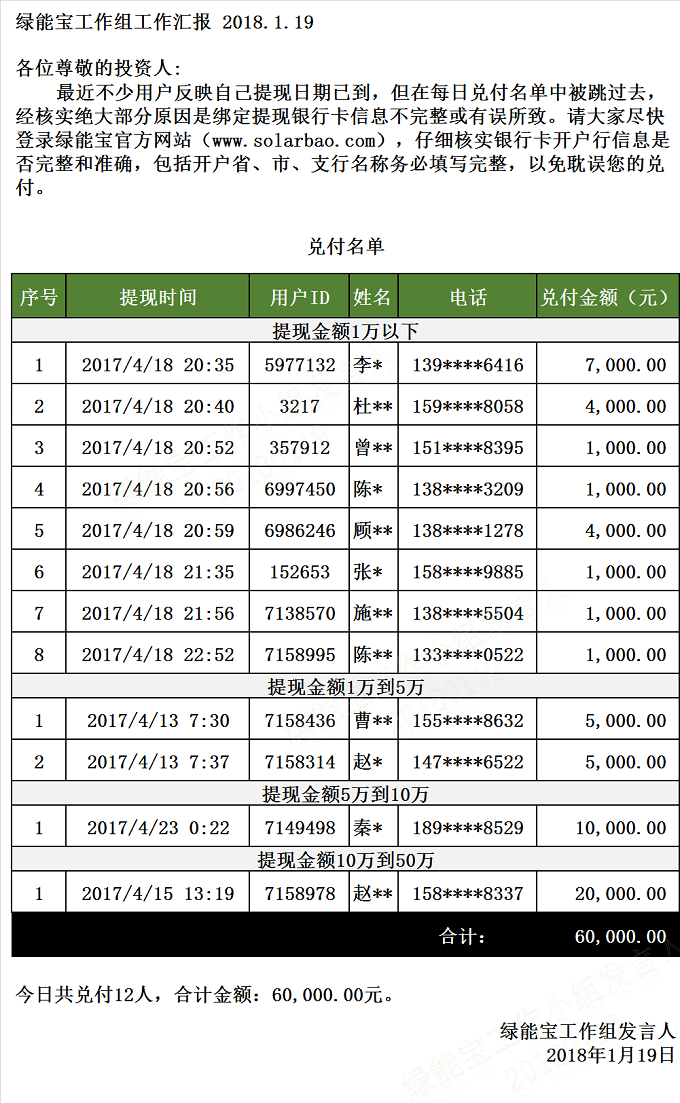 兌付名單(2018年1月19日)