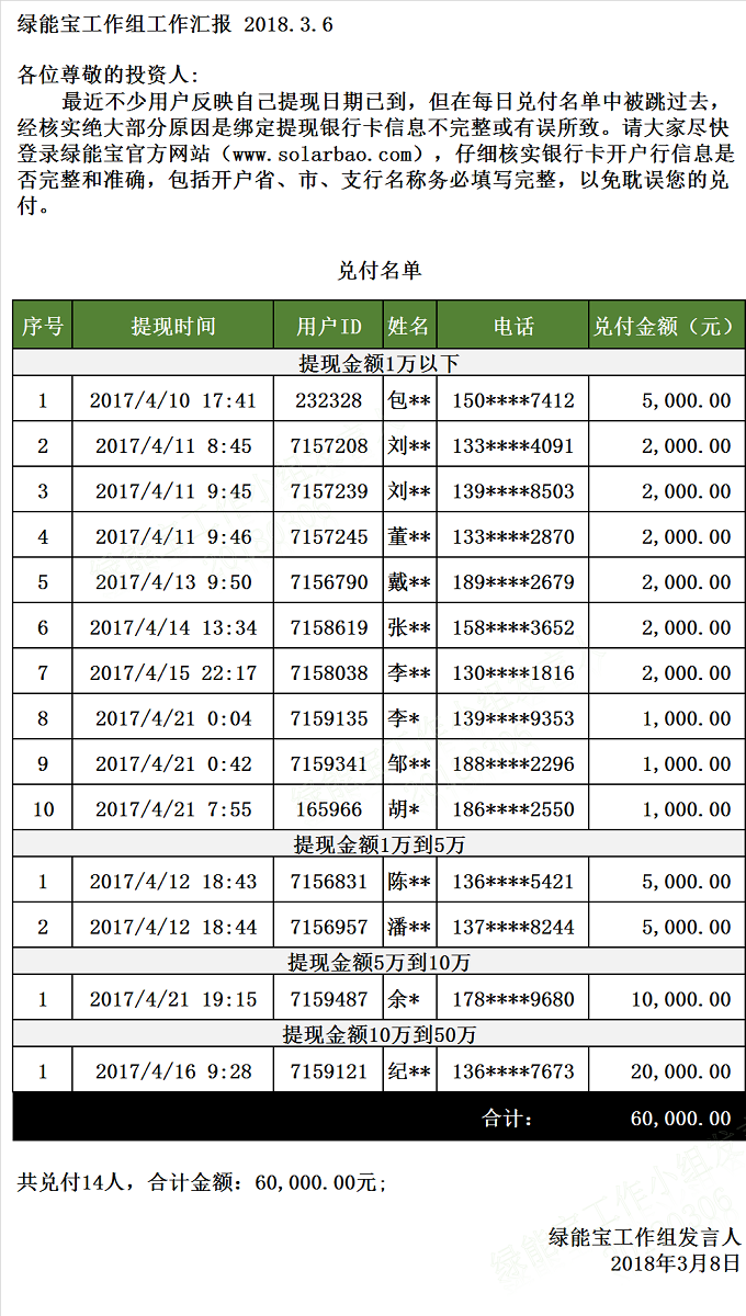 兌付名單(2018年3月6日)