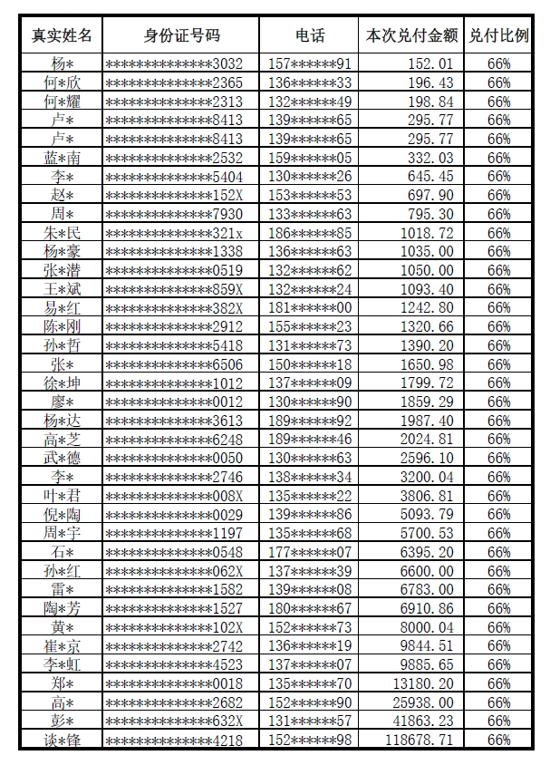 前期部分投資人由于銀行卡信息異常,導致無法完成兌付。后經(jīng)我們聯(lián)系溝通,部分投資人完善了銀行卡信息,現(xiàn)將目前已成功兌付人員名單公示如下: